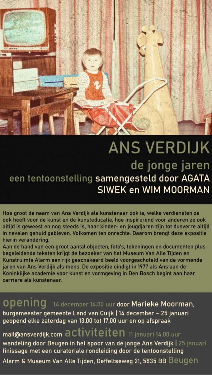 Aan de hand van een groot aantal objecten, foto’s, tekeningen en documenten plus begeleidende teksten krijgt de bezoeker van het Museum Van Alle Tijden en Kunstruimte Alarm een rijk geschakeerd beeld voorgeschoteld van de vormende jaren van Ans Verdijk als mens. De expositie eindigt in 1977 als Ans aan de Koninklijke academie voor kunst en vormgeving in Den Bosch begint aan haar carrière als kunstenaar.